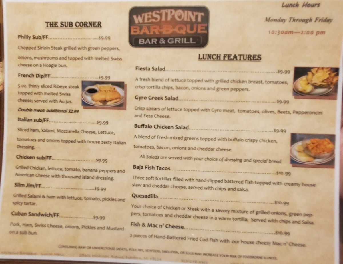 Welcome to Westpoint Bbq, a delightful barbecue gem located at 25301 Michigan Ave in Dearborn, MI. This barbecue restaurant showcases a tempting menu that caters to a variety of cravings. Whether you’re in the mood for their *50 Jumbo Wings*, luscious *Family Combo* meals, or hearty *Combos* like the *Cowboy Combo*, there’s something for everyone.